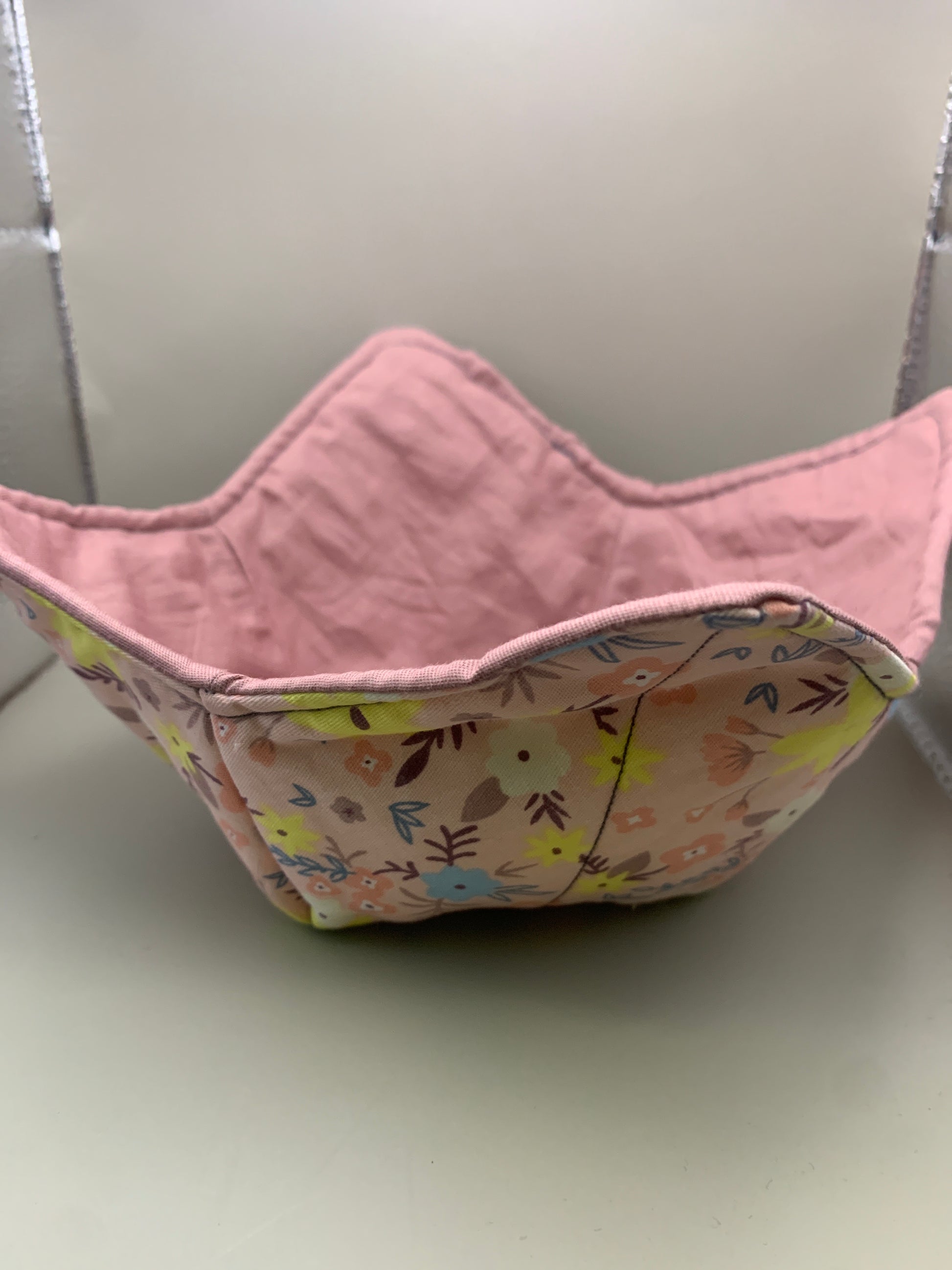 Keep your hands and lap safe from a hot bowl with this quilted bowl cozy. Microwave safe and heat resistant, makes an excellent way to hold onto warm bowls