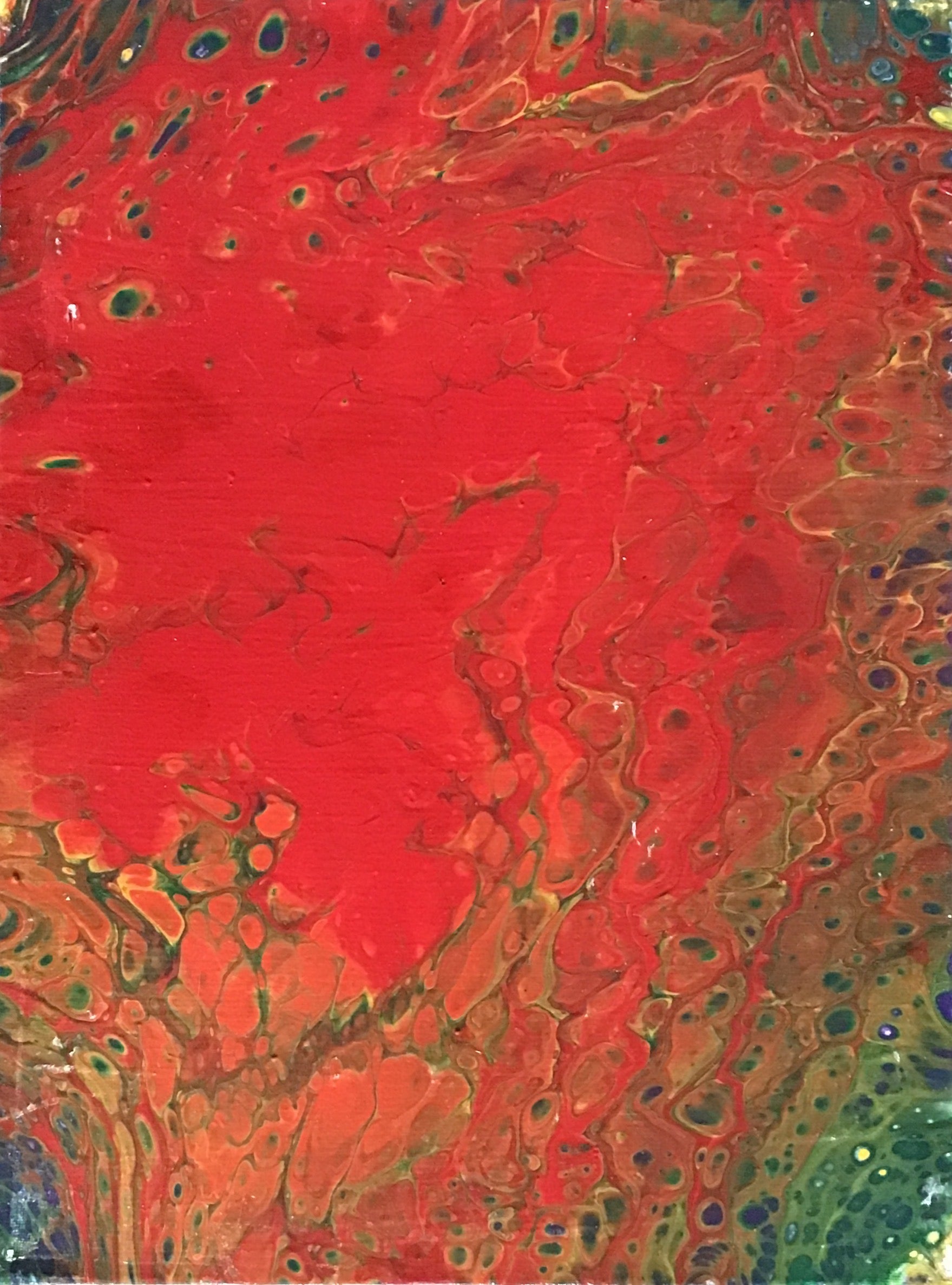 A 12x16 acrylic with predominantly red tones and underlying gem tones.