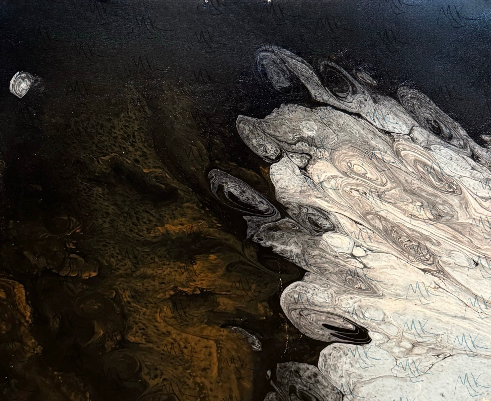 A 16x20 acrylic pour featuring opposing smoky and copper tones on a black background.