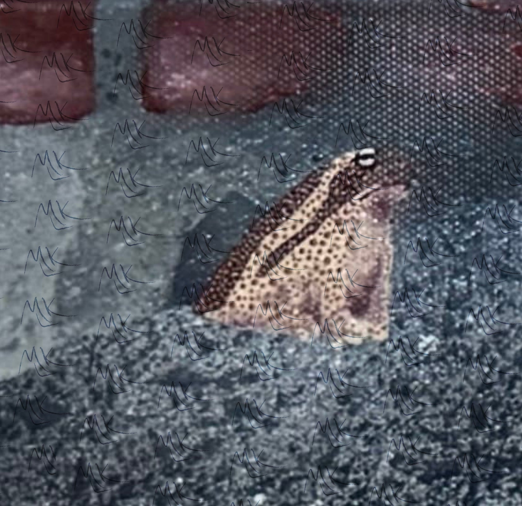A 4x4 acrylic painting of a frog wanting to know who is knocking on his door?