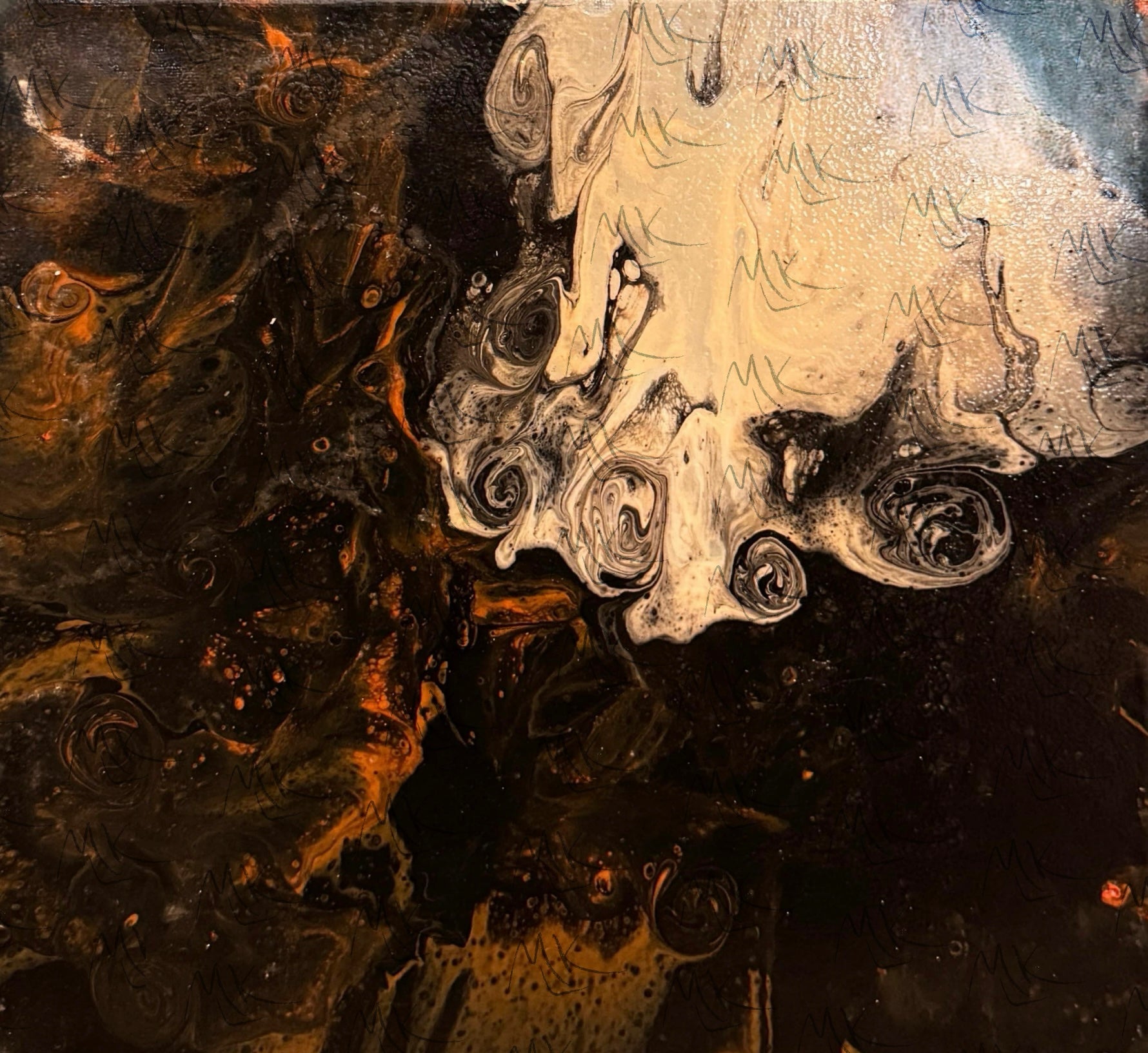 A 12x12 acrylic pour featuring heavy black tones with copper and smokey tones.