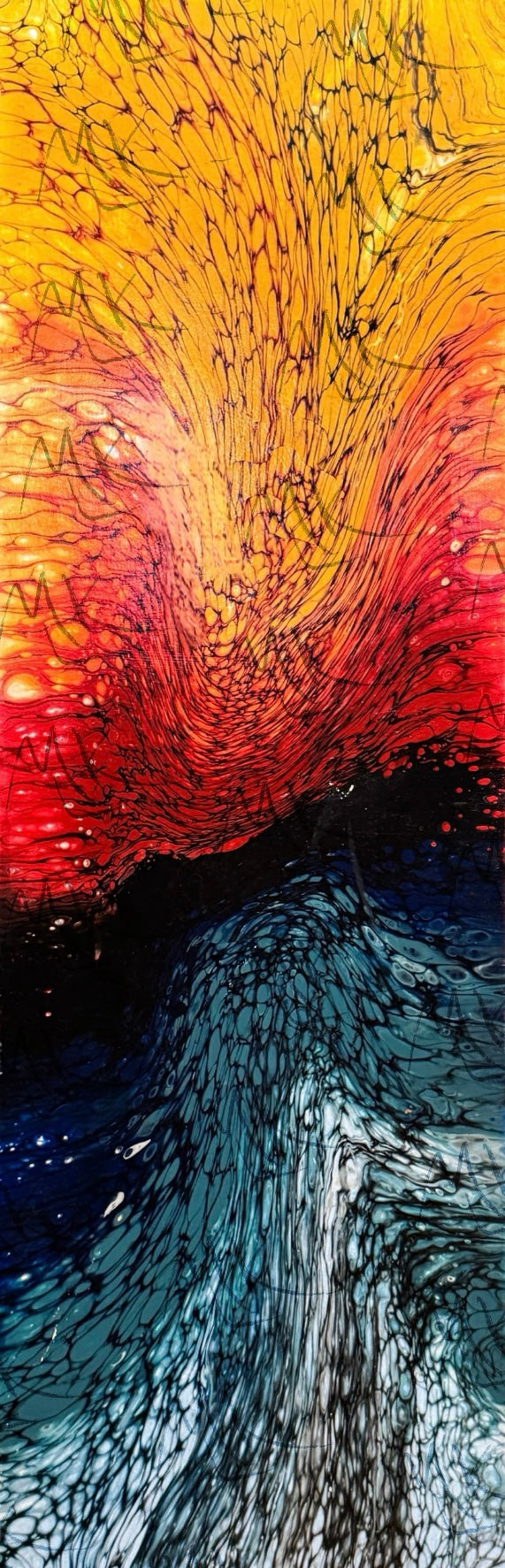 A 12x34 inch acrylic pour with opposing fire and water colorways.