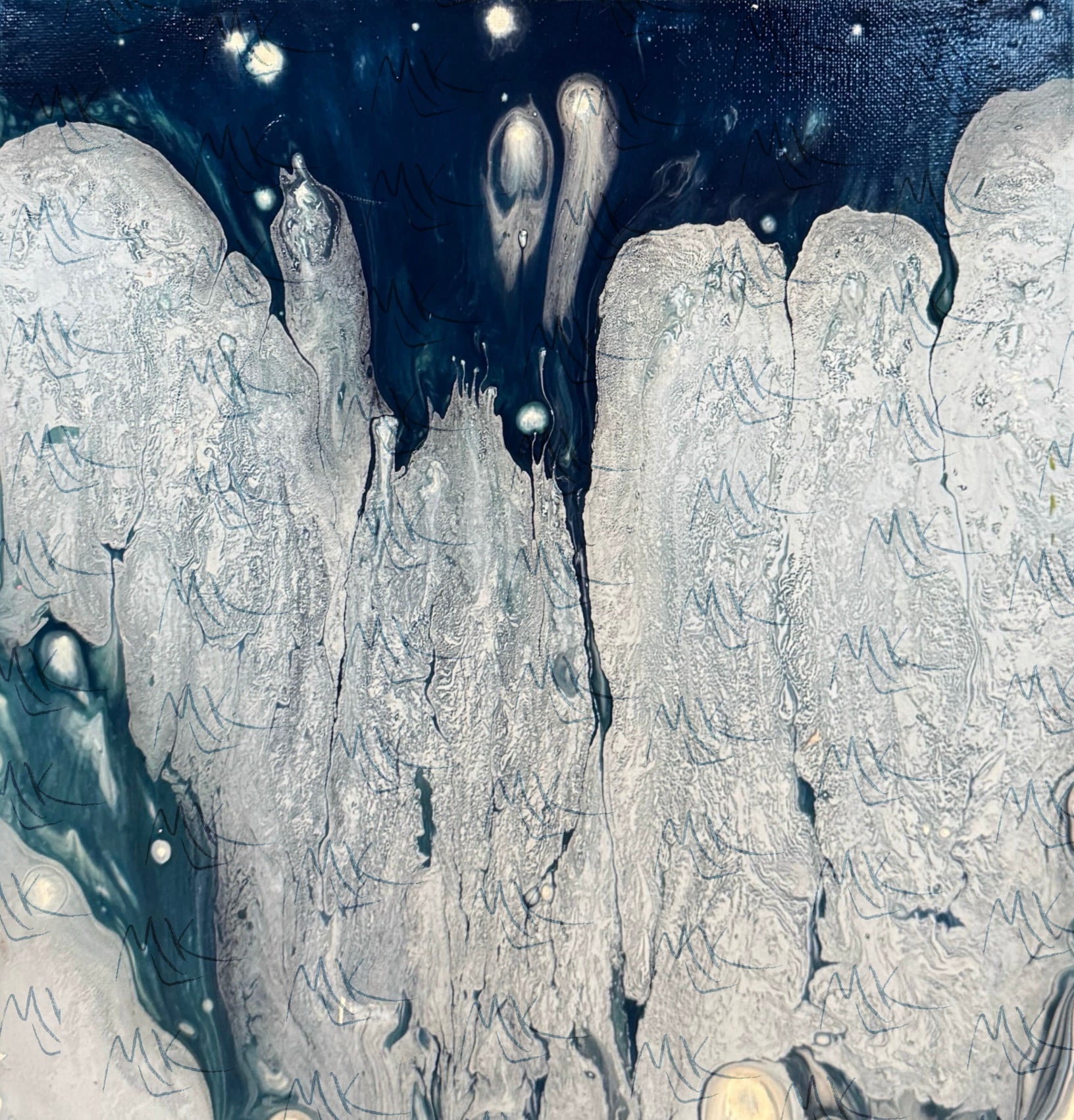 A 12x12 water themed pour on white canvas. This is painting 2 in an 8 part series.