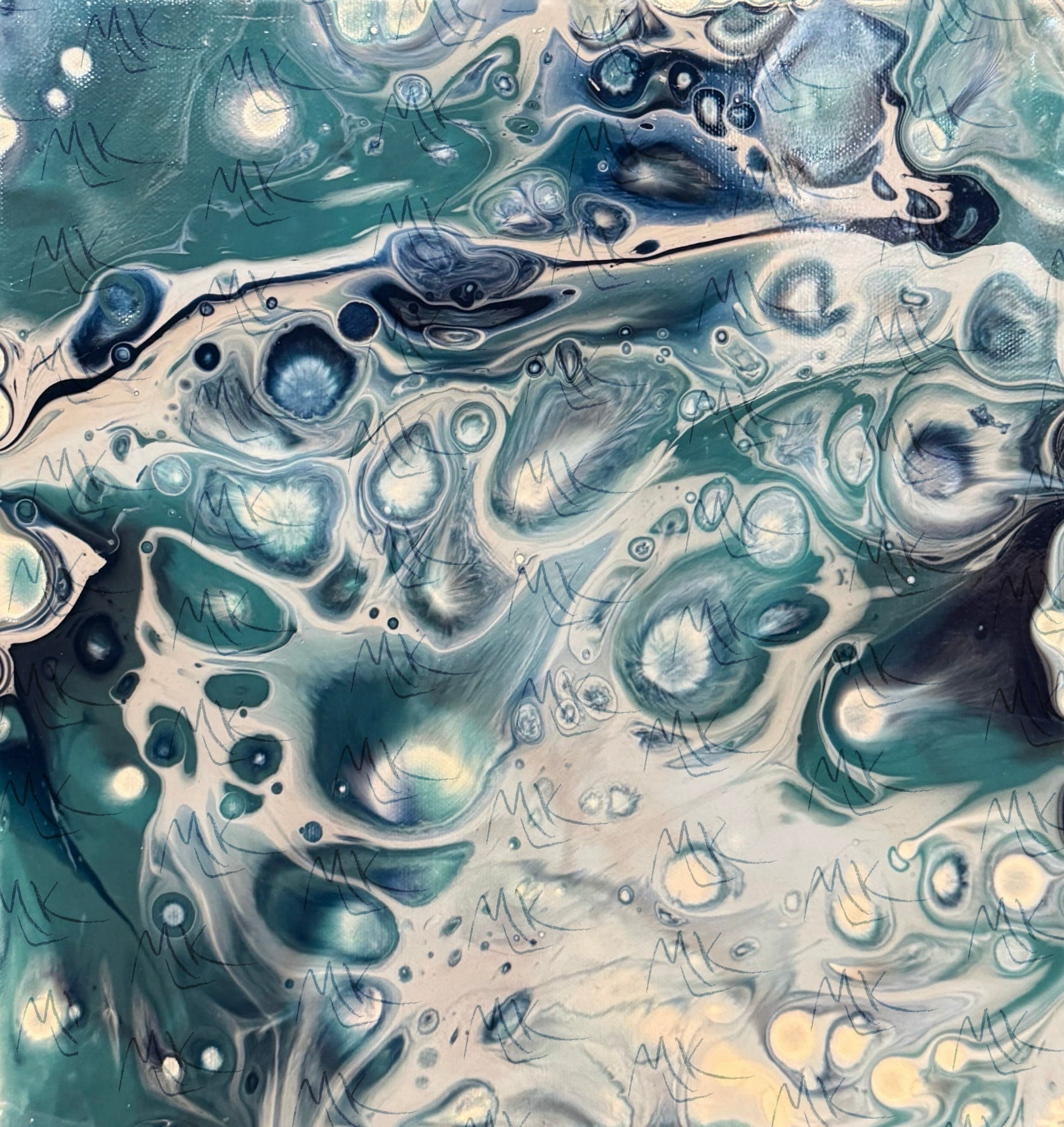 A 12x12 water themed pour on white canvas. This is painting 3 in an 8 part series.