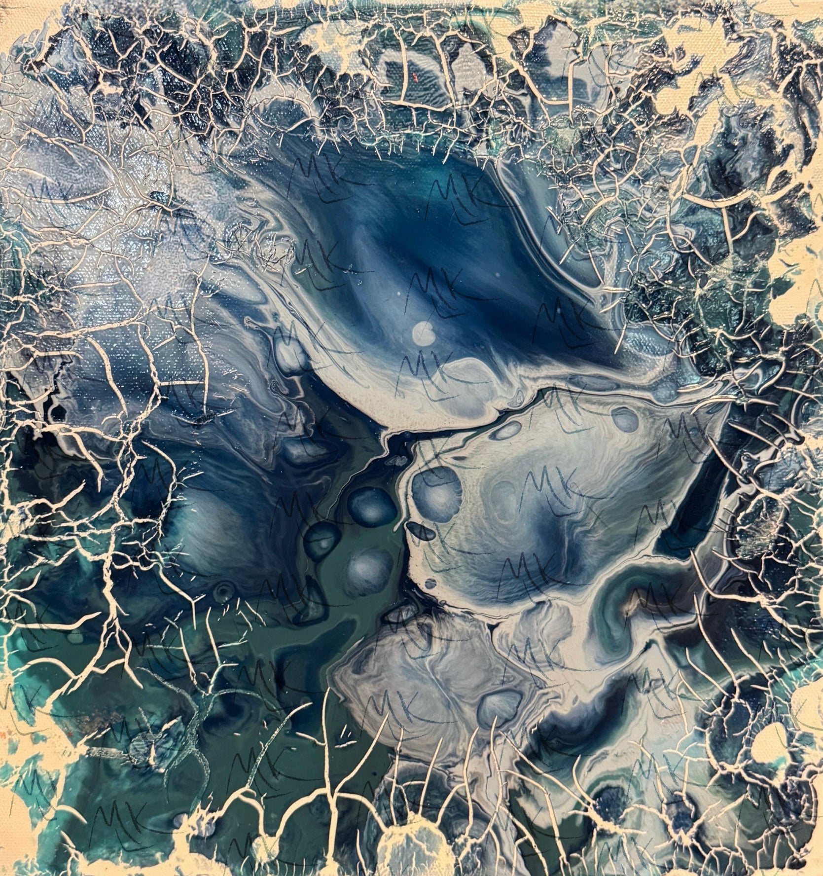 A 12x12 water themed pour on white canvas. This is painting 4 in an 8 part series.